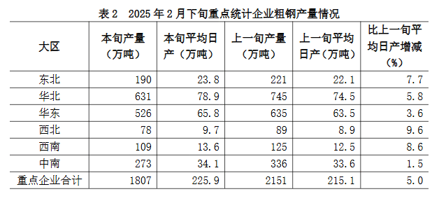 2月下旬六大地區(qū)重點(diǎn)統(tǒng)計企業(yè)粗鋼日產(chǎn)量較上一旬均有不同程度增長(詳見表2),具體為:
