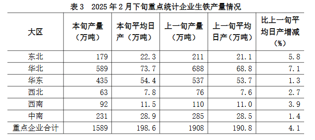 2025年2月下旬,重點(diǎn)統(tǒng)計鋼鐵企業(yè)共生產(chǎn)粗鋼1807萬噸,平均日產(chǎn)225.9萬噸,日產(chǎn)環(huán)比增長5.0%;生鐵1589萬噸,平均日產(chǎn)198.6萬噸,日產(chǎn)環(huán)比增長4.1%;鋼材1841萬噸,平均日產(chǎn)230.1萬噸,日產(chǎn)環(huán)比增長13.0%(見表1)1。